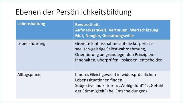 Aus dem Schaubild wird ersichtlich, dass Persönlichkeitsbildung auf drei Ebenen stattfindet: Ebene der bewussten Lebenshaltung, Ebene der reflektierten und zielgerichteten Lebensführung, Ebene der Alltagspraxis in widersprüchlichen Lebenssituationen.