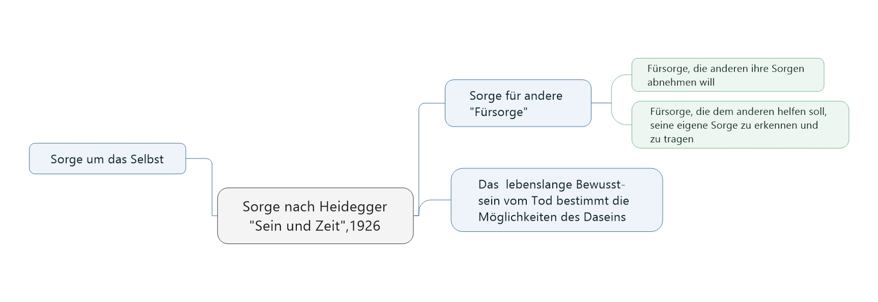 Für den Philosophen Martin Heidegger ist die Sorge eine Existenzform des menschlichen Lebens. Er unterscheidet in seinem Buch „Sein und Zeit“ (1926) zwischen der Sorge um das Selbst und der Sorge für andere, der Fürsorge. Die Fürsorge hat „hinsichtlich ihrer positiven Modi zwei extreme Möglichkeiten“: die „einspringende“ Fürsorge, die anderen ihre Sorgen abnehmen will, und die „vorausspringende“ Fürsorge, die dem anderen helfen soll, seine eigene Sorge zu erkennen und zu tragen (5).